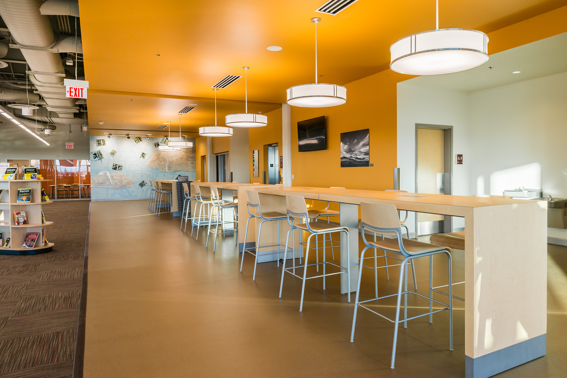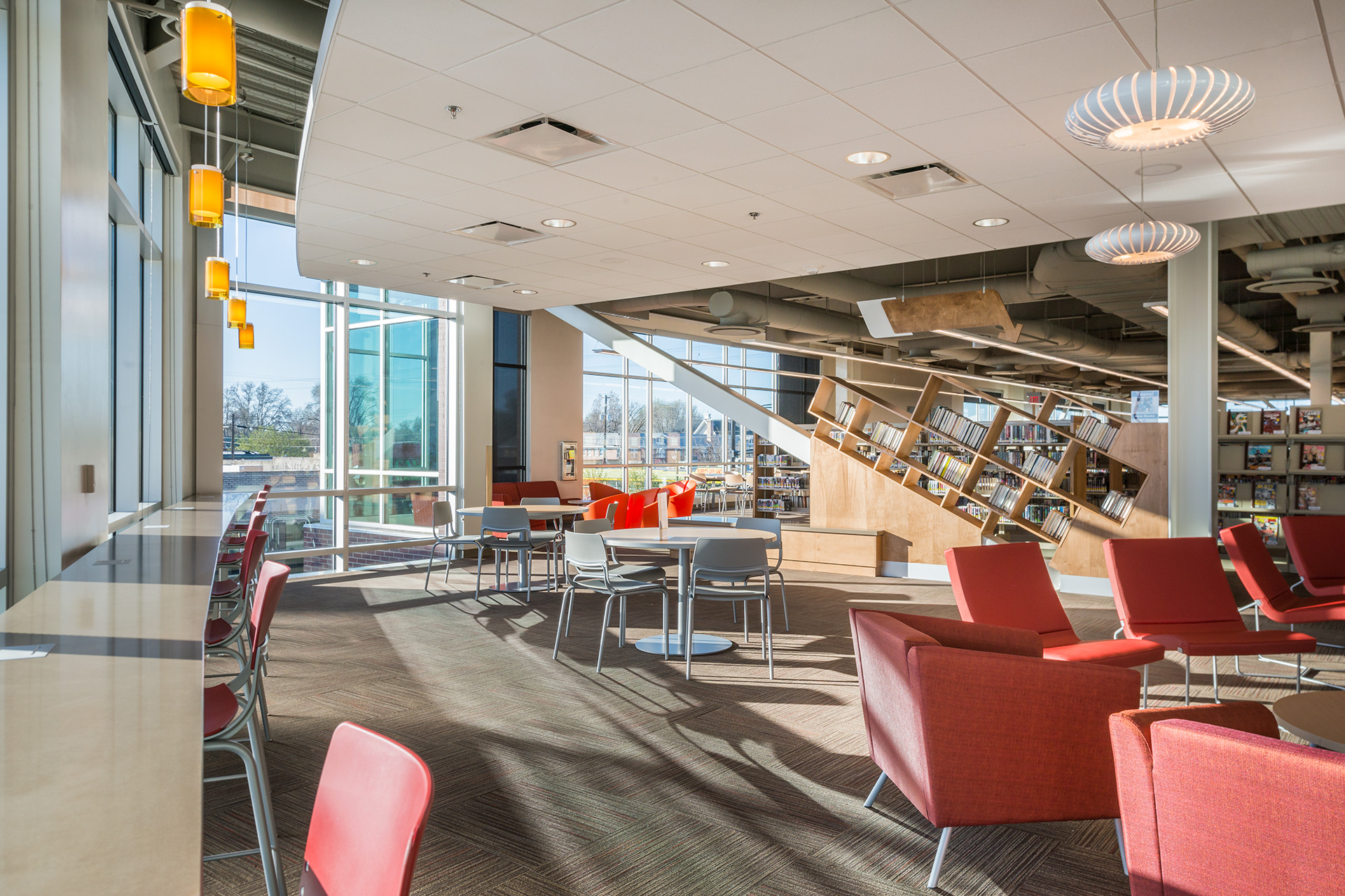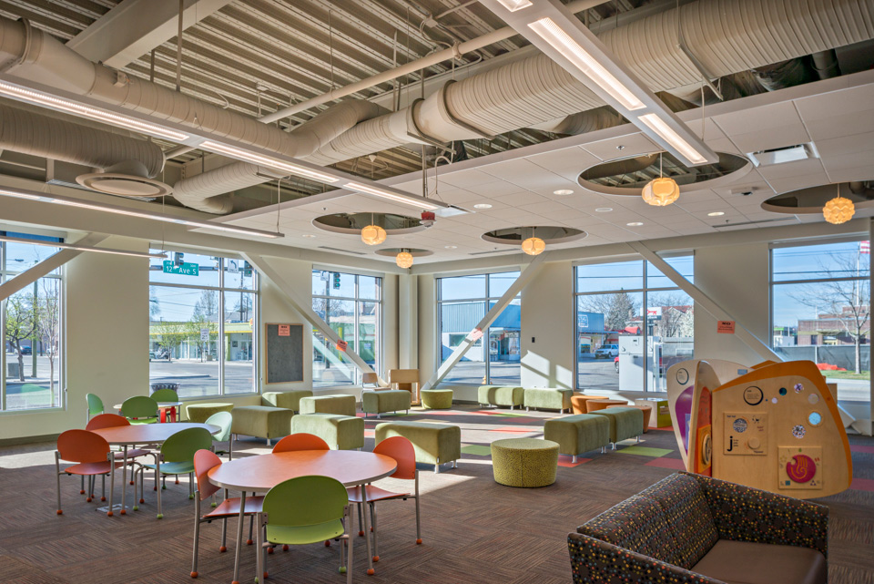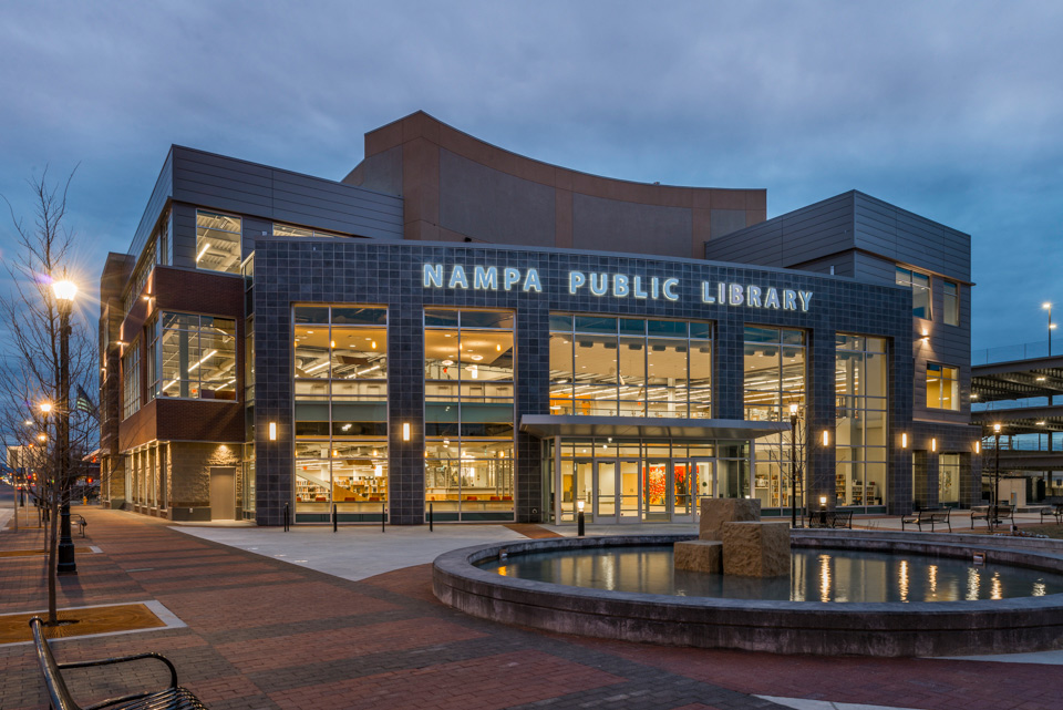 Nampa Library is the focal point of Nampa Library Square, a redevelopment of an entire city block in downtown Nampa, Idaho. The 3-story, 62,000-sf library is the main anchor for the block and serves as part of the community center and part of the gathering space. This cutting-edge library also has a third-floor exterior patio that looks onto the plaza below.