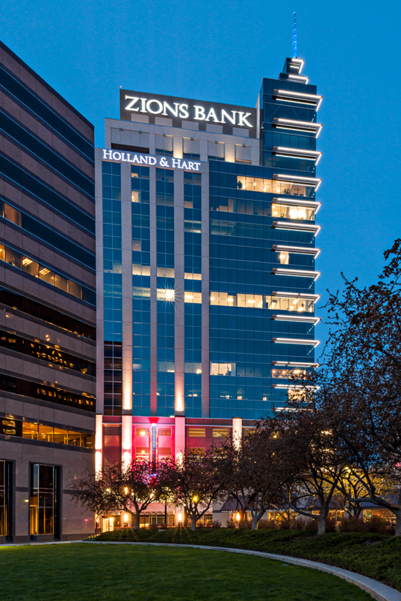 At 268,000 square feet, the building houses office and retail space across its full height, with three levels of parking below and 180 stalls. Anchor tenants include Holland and Hart and Ruth's Chris Steakhouse, while a second-level mezzanine — connected to the street by escalator — draws visitors up into two additional restaurants overlooking the energy of the corner below.
