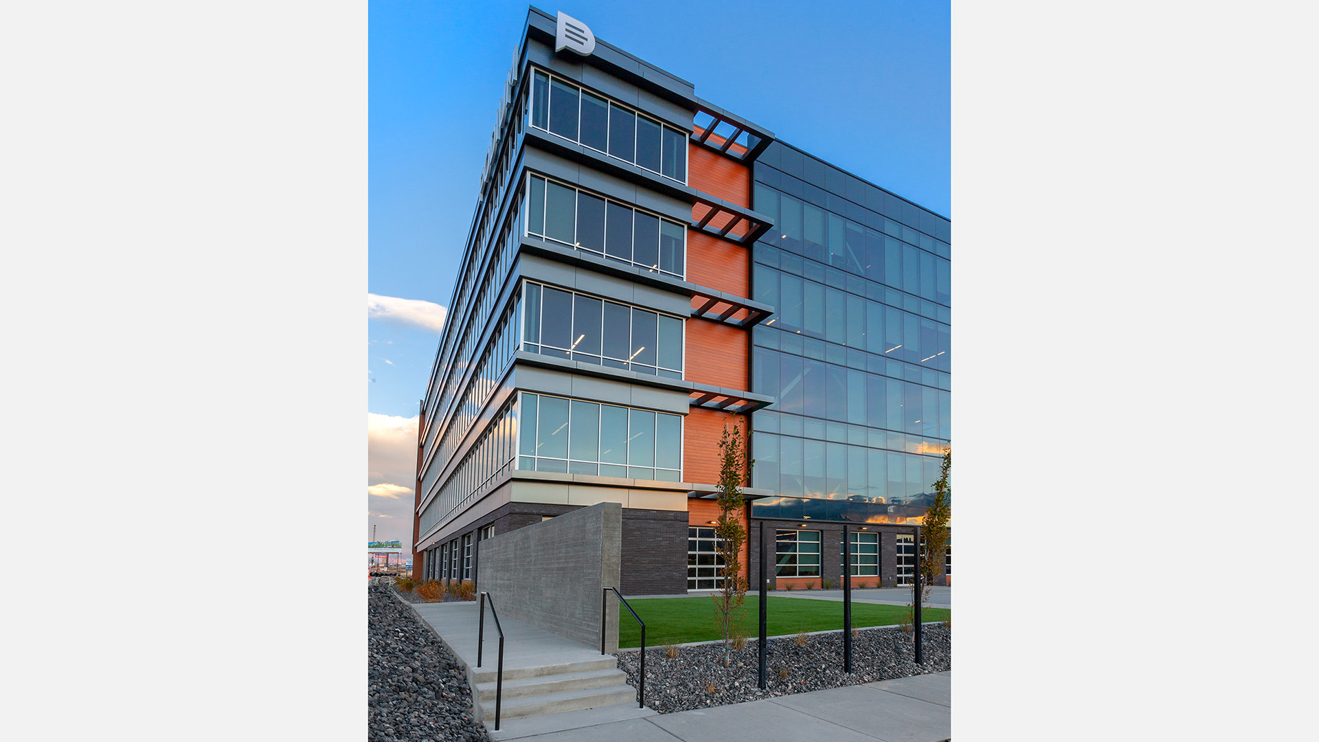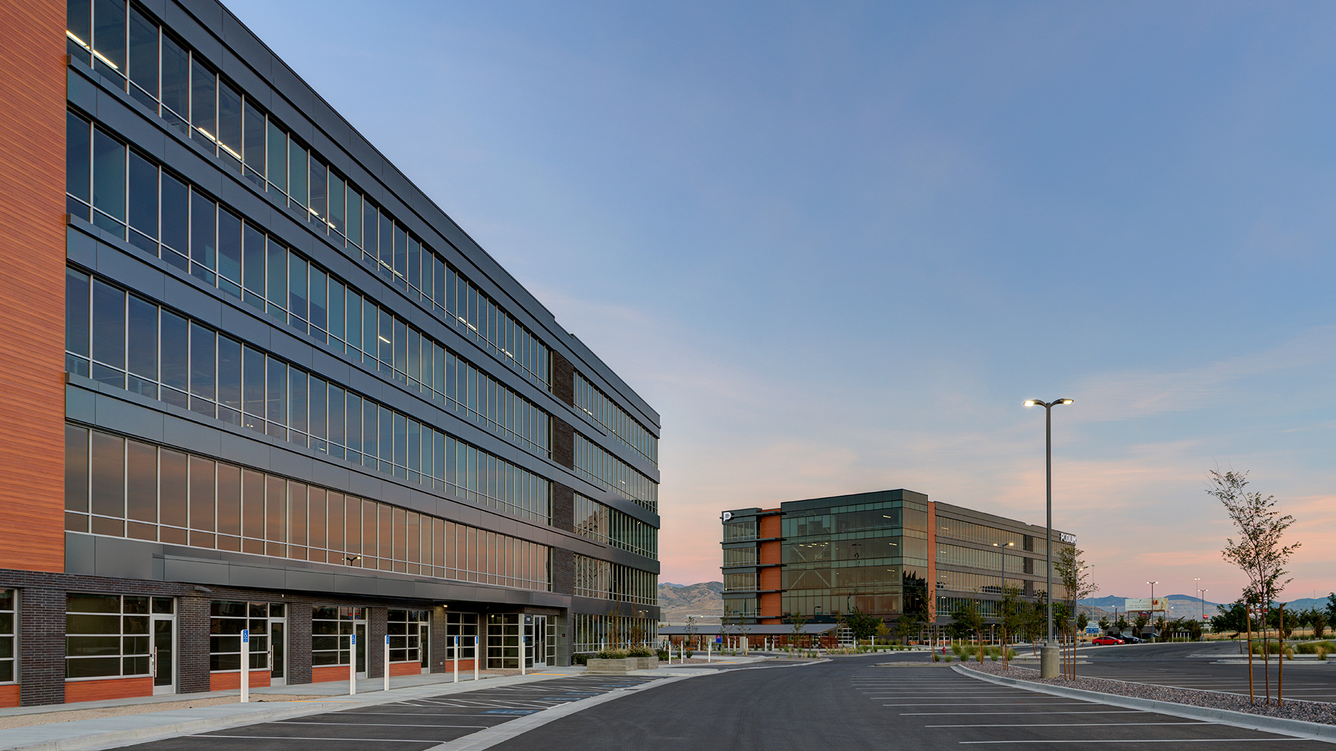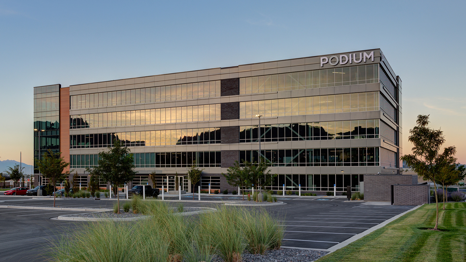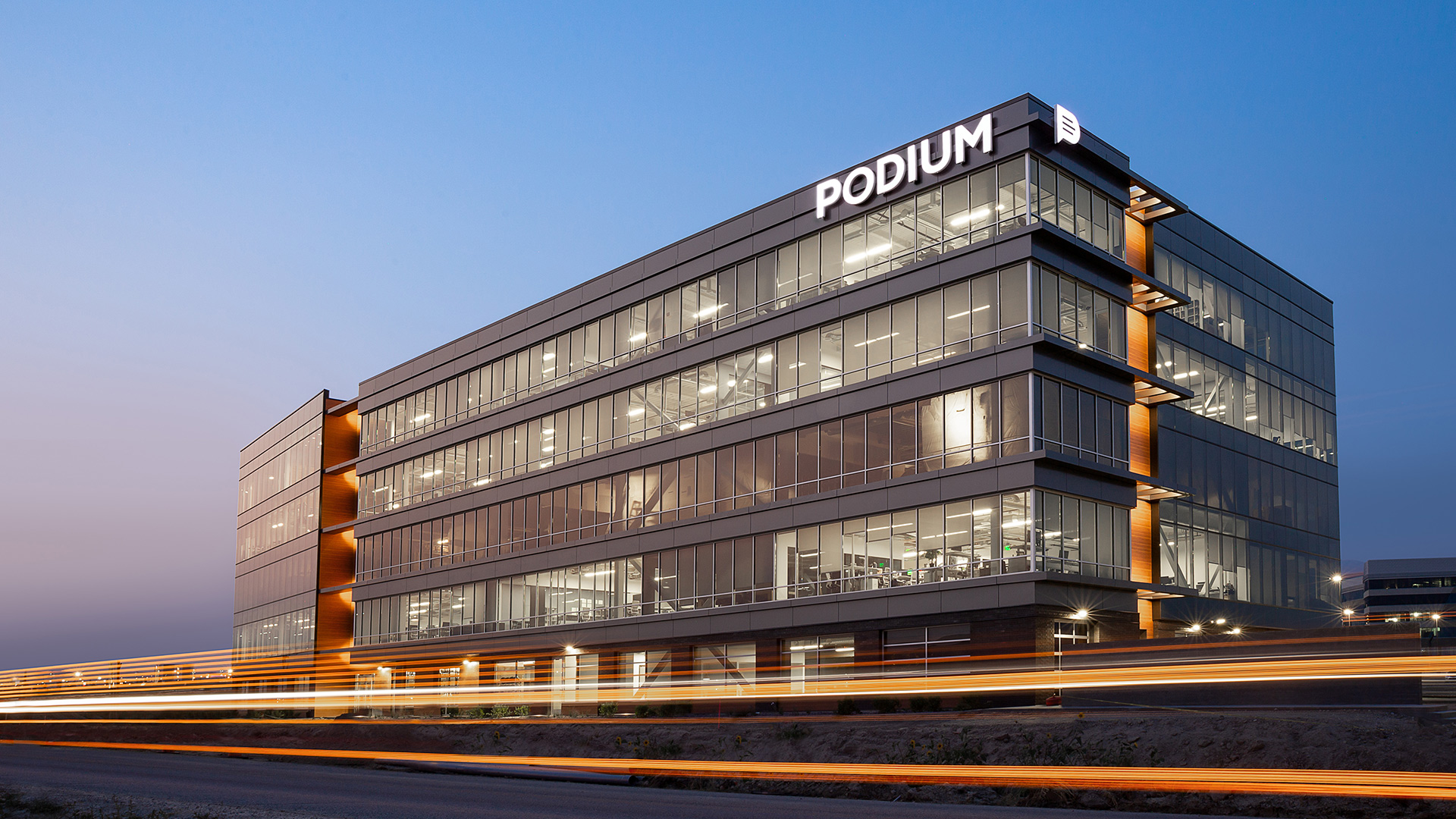 The campus for Podium includes two buildings, each 125,000 SF and five stories tall. Featured is floor-to-ceiling glass with a custom angled curtain wall exterior. Important to Podium’s culture, full amenity spaces, including a BBQ cooking area, outdoor dining, basketball and pickle ball courts and covered parking with PV paneling make this office building an inviting place for their employees.
