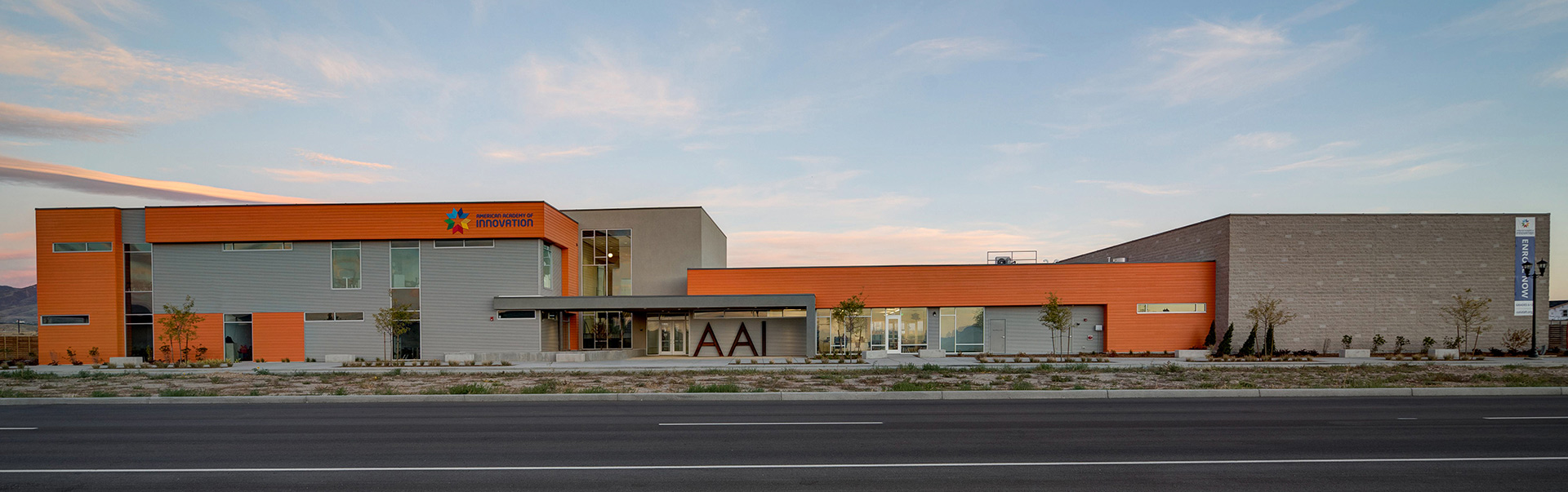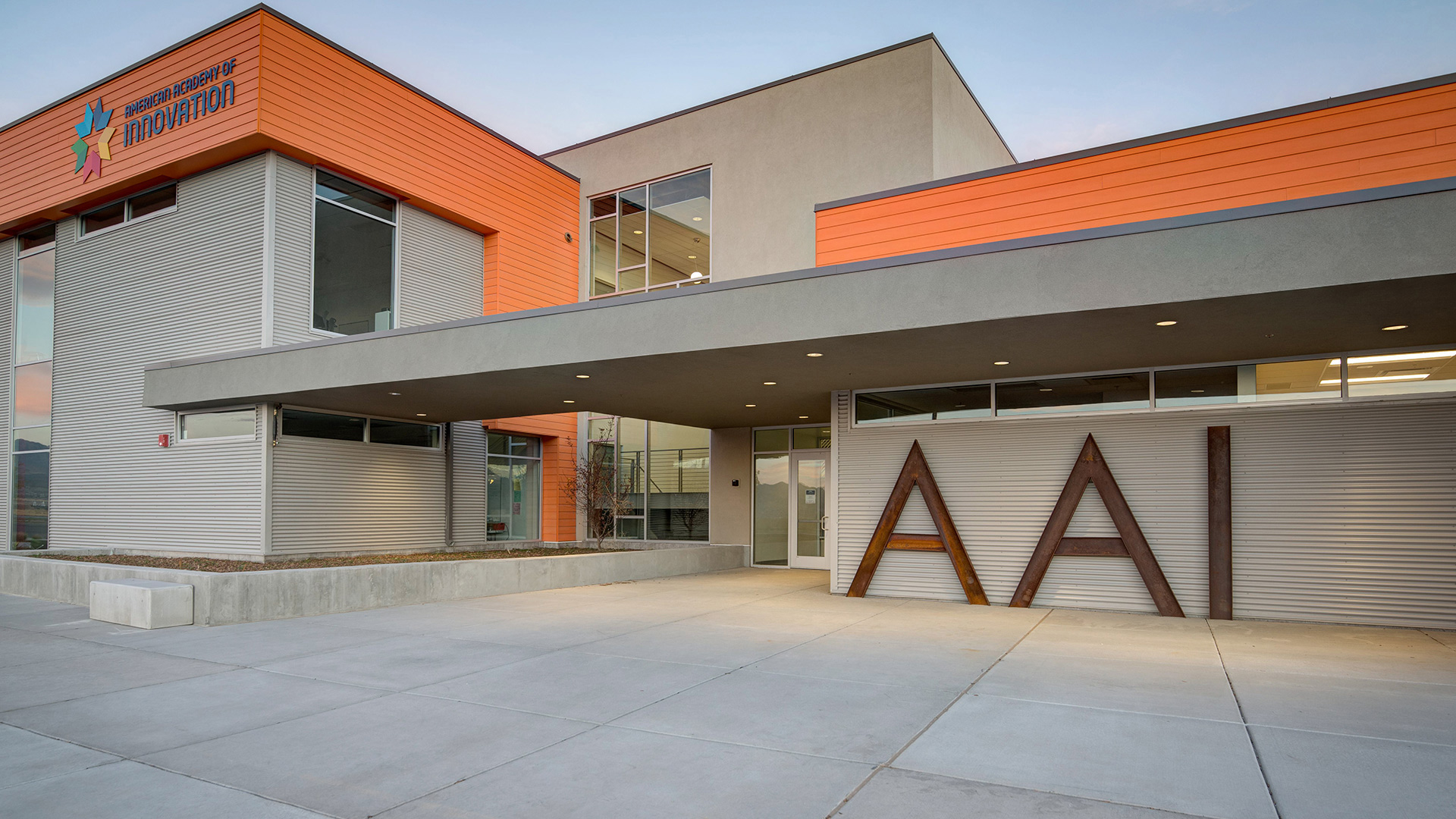 The American Academy of Innovation (AAI) is a 33,000-square-foot school in Daybreak, South Jordan, Utah, serving grades 6-12. Opened in fall 2016, the school focuses on project-based learning, career and technical education (CTE), and partnerships with international universities, preparing students for a global marketplace. Its design combines bold, modern aesthetics with functionality, reflecting its innovative educational approach.
