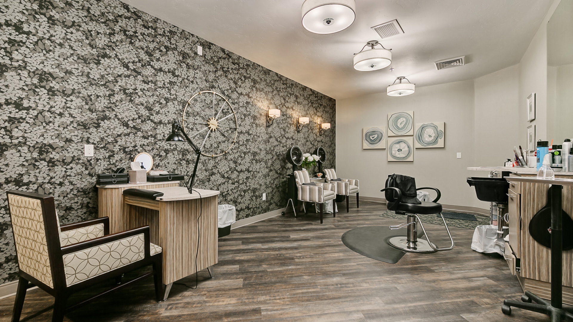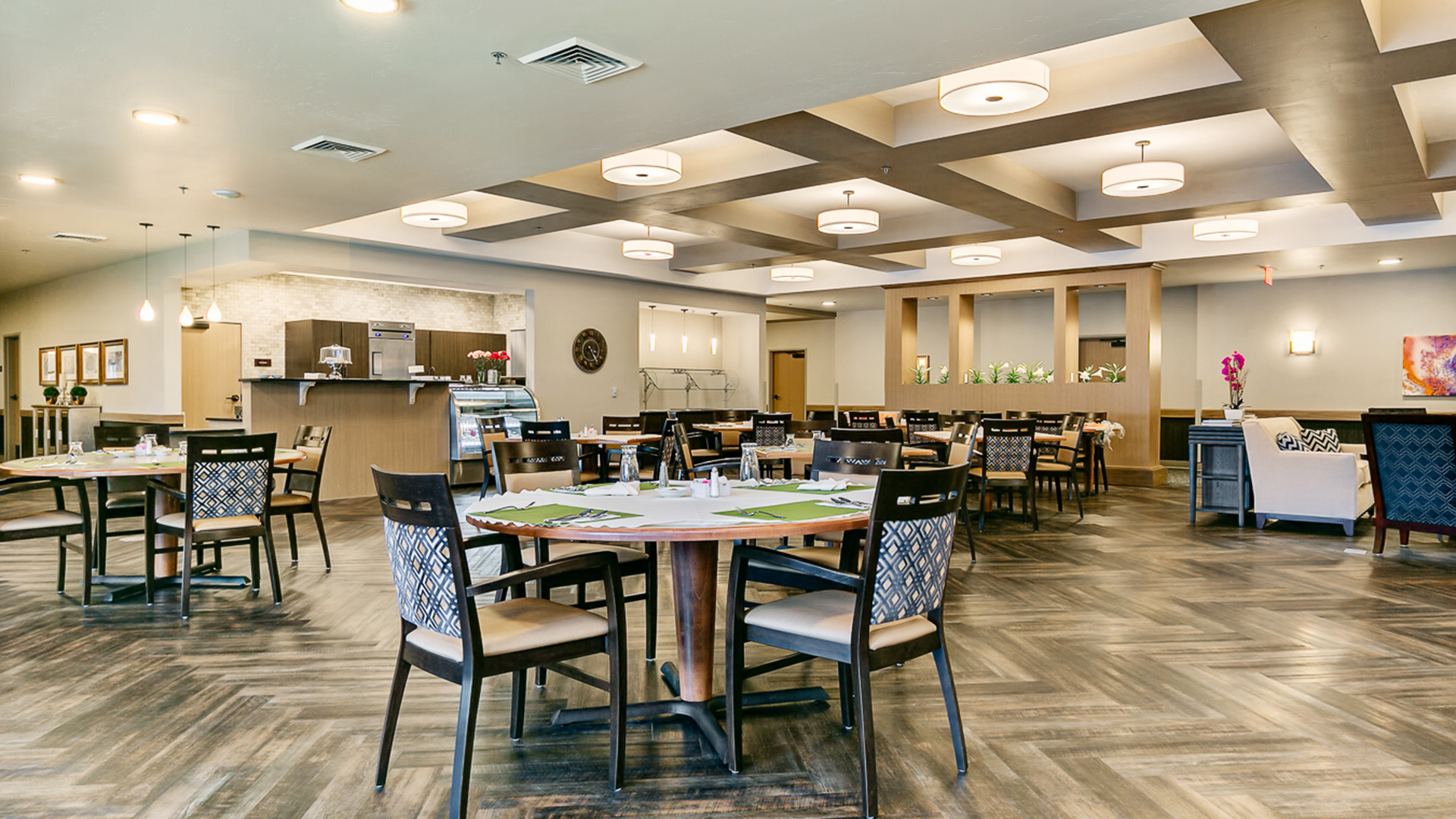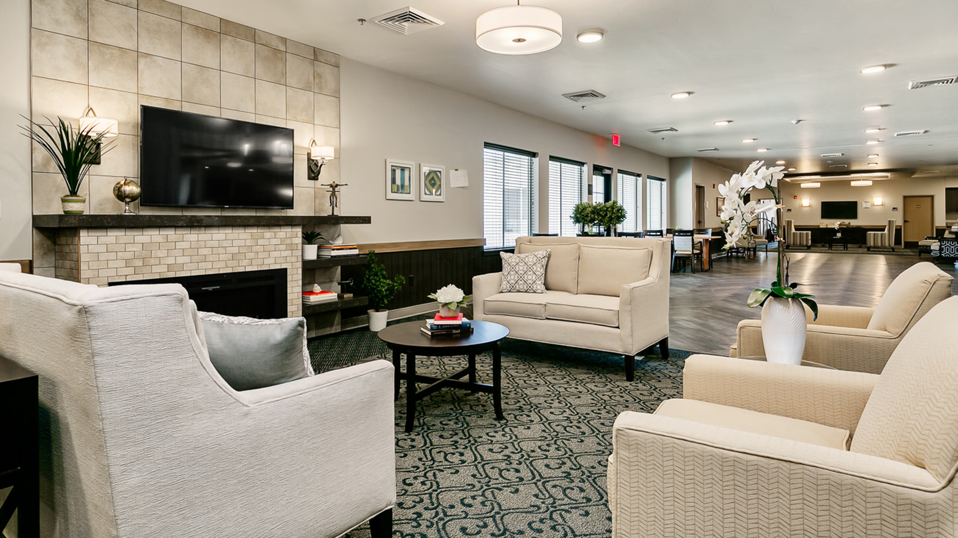The unique design of this single-story senior living facility is functional while maintaining an at-home feel. It comprises 73 resident units, including 38 assisted living and 35 for memory care patients. Features include a full-service salon, workout area, a putting green, and a memory care courtyard that allows residents to move throughout the space without feeling confined. Babcock Design worked with the limited spaces in the building by using multi-functional designs - for example; the chapel is also utilized as the library and family meeting areas. Veranda Senior Living Center is part of the final phase of the Paramount Development, with the goal of keeping families together throughout all stages of life.