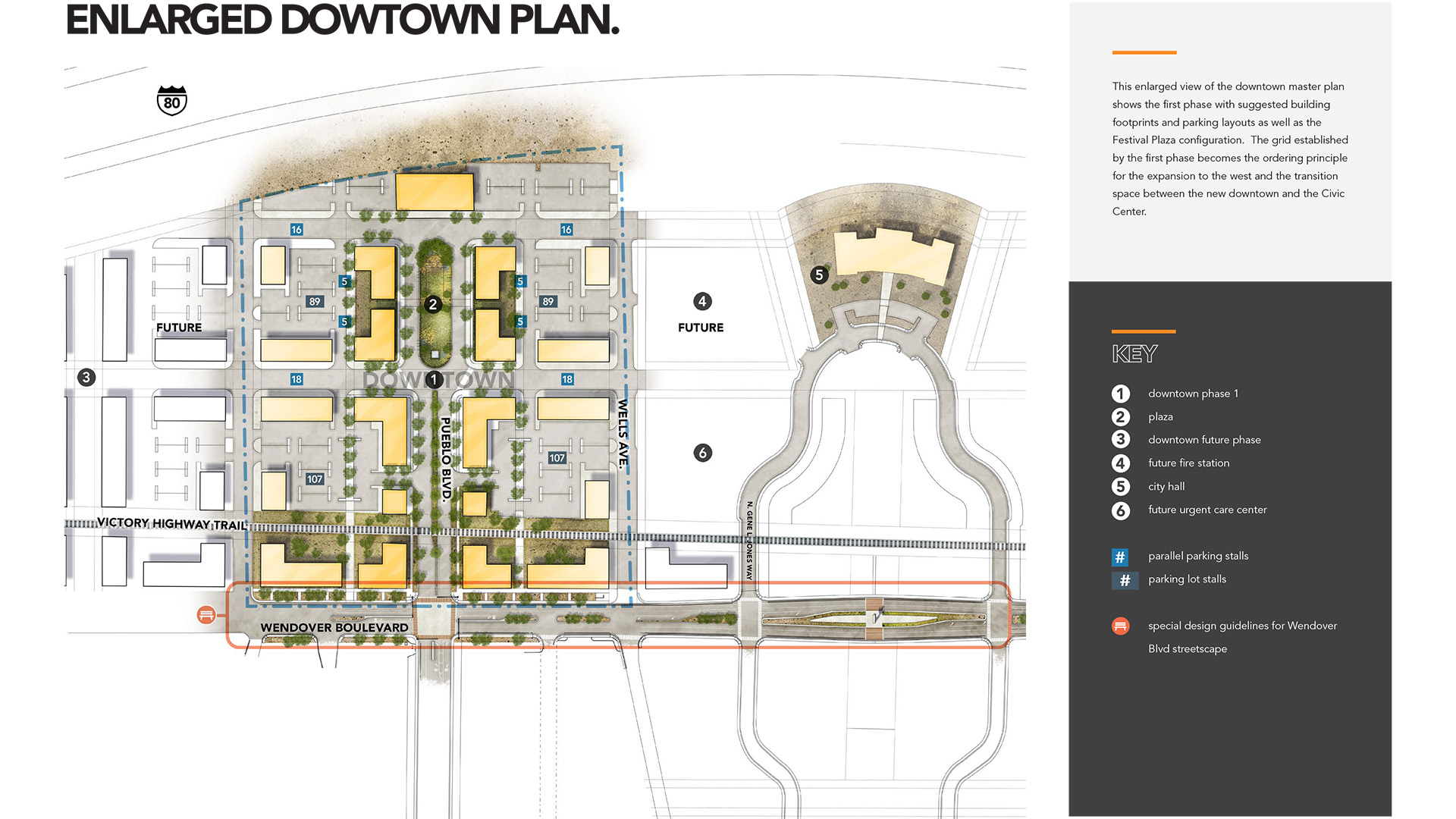 The West Wendover Downtown Master Plan aims to establish a new downtown area adjacent to a new civic center. The plan involves extending Pueblo Boulevard, a major thoroughfare that connects the new downtown with the community. The development will be a higher-density mixed-use, including retail, offices, restaurants, and a public plaza for community events. The main goal of this plan is to create new spaces where local citizens can gather and experience the unique culture and landscape of West Wendover. Additionally, it will provide a stopping point for travelers along I-80 to take a break and explore the area.
