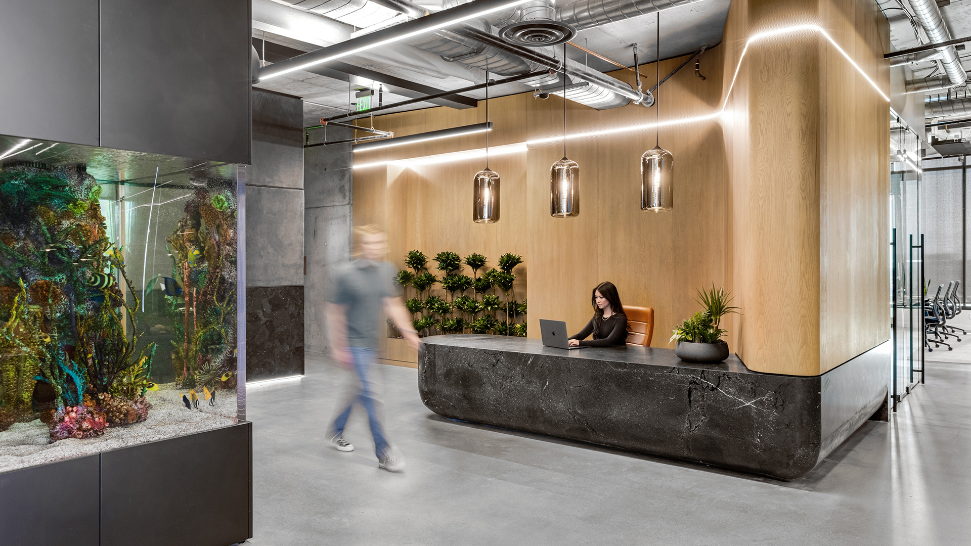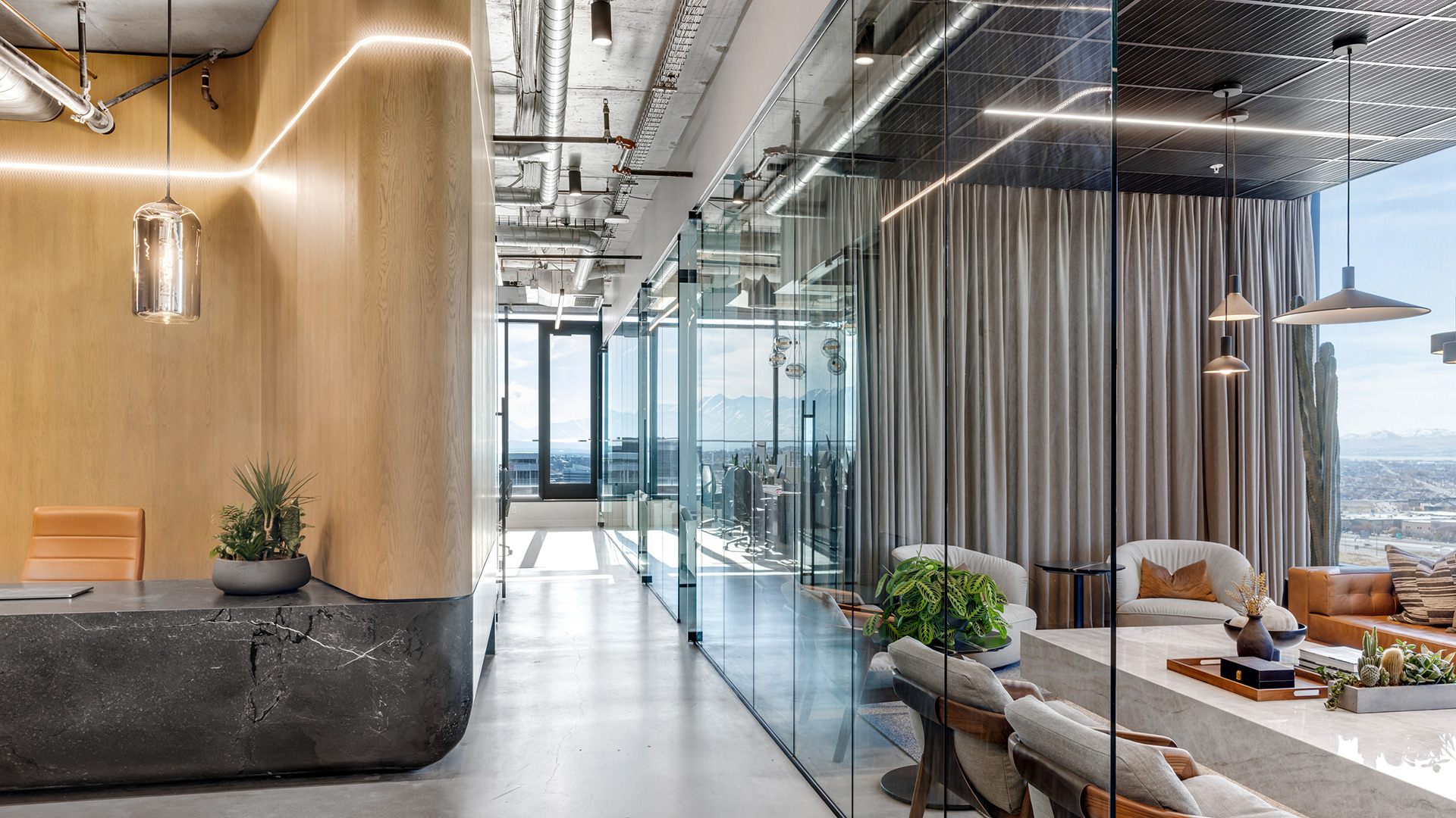Woodley Real Estate had a clear ambition: an office that felt nothing like one. The response was a workplace designed through the lens of a luxury hotel — where natural wood and stone warm a concrete shell into something industrial and sophisticated at once. The lobby sets the tone immediately, anchoring a welcoming lounge around a commanding three-sided fireplace. Beyond it, a radius reception desk curves into the space alongside an integrated planter and a carefully considered open plan that moves fluidly between private offices, collaboration zones, and a break room adjoining a game lounge — spaces that reflect the at-home culture Woodley actively cultivates.