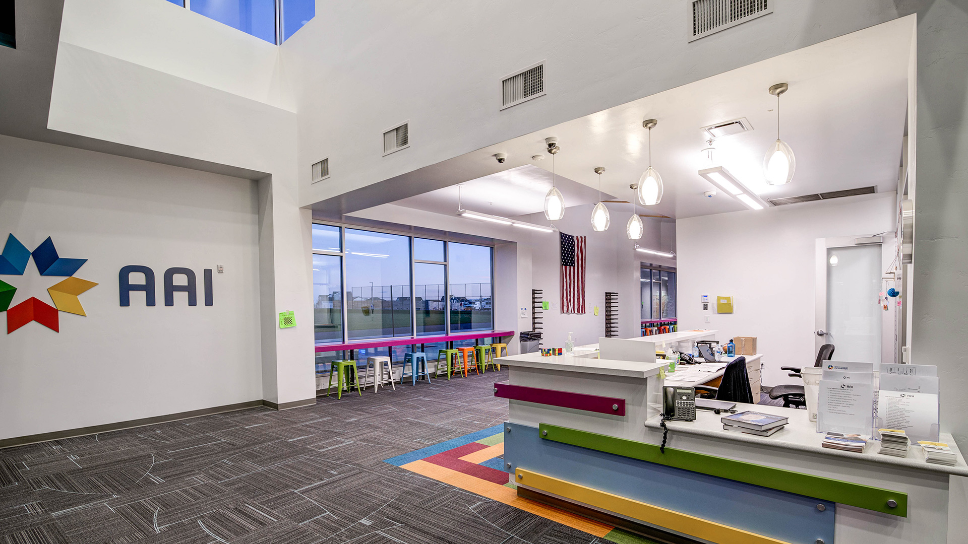 The American Academy of Innovation was designed for a school that doesn't operate like most schools. AAI's focus on project-based learning, career and technical education, and partnerships with international universities demanded a facility that reflected those ambitions from the outside in. The 33,000-square-foot Daybreak campus serves grades 6-12 with a two-story lobby at its center — a connector that links classrooms and activity areas while encouraging the kind of spontaneous interaction that project-based learning depends on. Exterior masonry, metal panels, stucco, and vibrant color accents give the building a distinct visual identity within the Daybreak community, while outdoor gathering areas and a soccer field extend the collaborative culture beyond the classroom walls. Babcock worked closely with the school board, developer, and Rio Tinto to balance educational functionality with community design standards — producing a building that feels like a landmark because it was designed to be one.