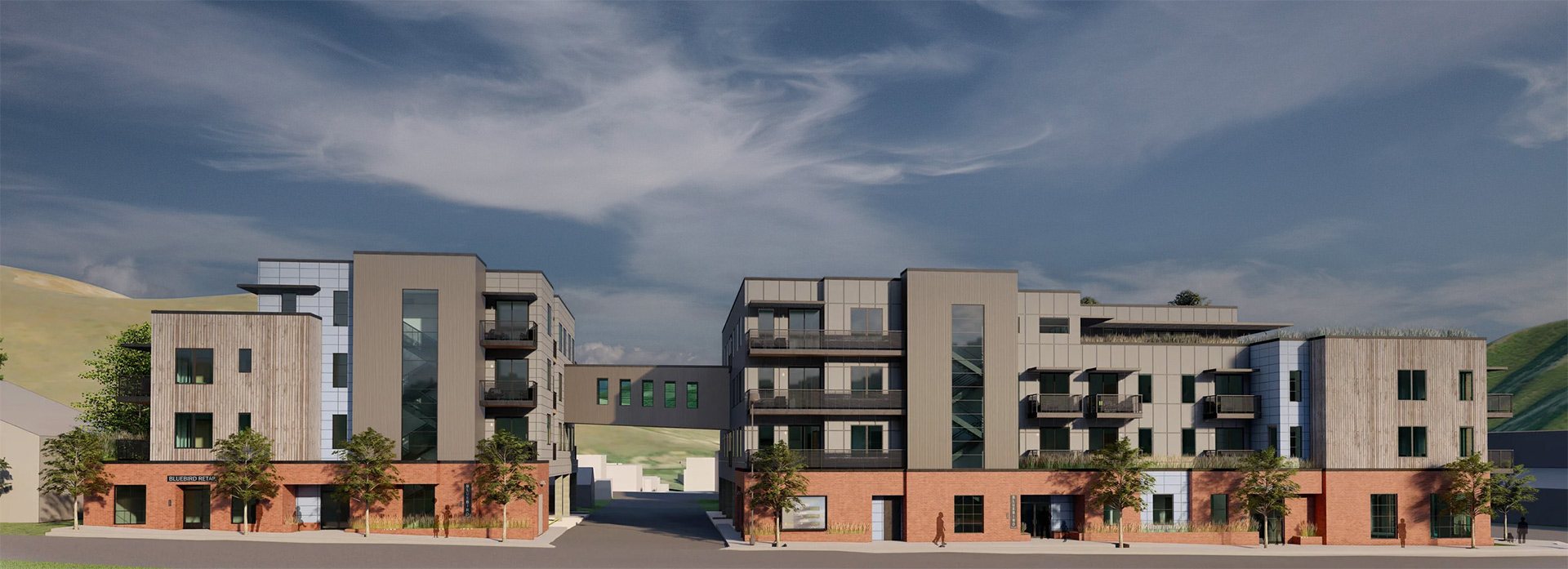Ketchum is one of Idaho's most desirable places to live — and one of its least affordable. Bluebird Village addresses that directly, delivering 51 workforce housing units in the heart of a community that depends on the people who can least afford to live there. The LIHTC development connects two buildings via a sky bridge in an efficient 3-over-1 podium configuration, with one, two, and three-bedroom units serving the full range of household sizes. Ground-floor commercial space activates the street, while a rooftop terrace with Sawtooth Mountain views, a multi-purpose room, and a fitness center ensure residents have amenities that match the quality of the place they call home. Rooftop solar and green roofs round out a development that takes its environmental responsibilities as seriously as its community ones.
