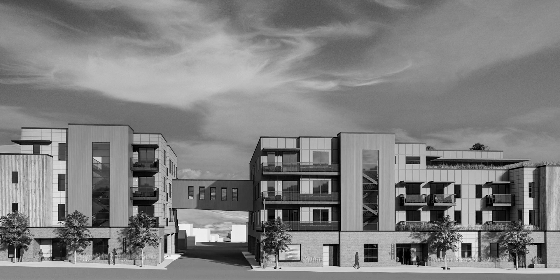 Alta Point Apartments brings 400 homes to one of Utah's most anticipated redevelopments — the 600-acre transformation of the former Utah State Prison site in Draper. The two-phase affordable housing project sits on four acres directly along the Neighborhood Trail, connecting residents to the River-to-Range regional trail system and the masterplan's central Promenade and Green. The building's organization is as considered as its context: five levels of wood-framed construction over a two-level Type I podium house parking, amenities, and trail-facing stoop units that activate the ground plane. Mid-block, the massing splits deliberately to form a central canyon — a passage that draws the eye from street to interior courtyard, where the architecture shifts in character from the public-facing elevations. It's a project that earns its density by spending it well.