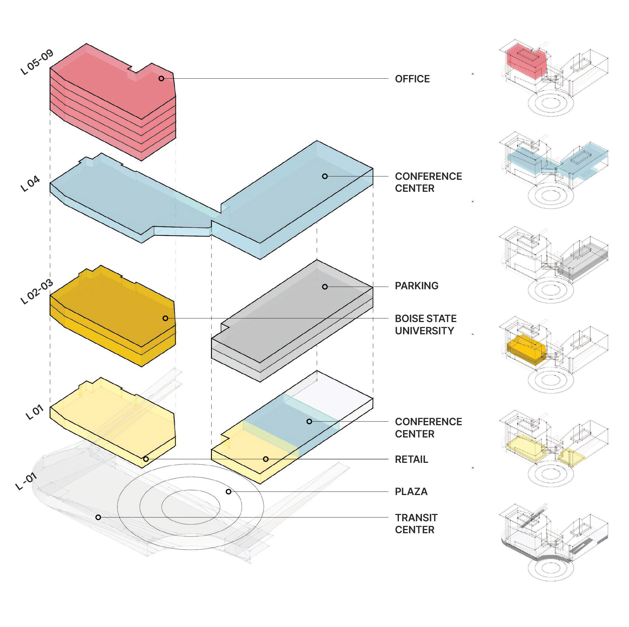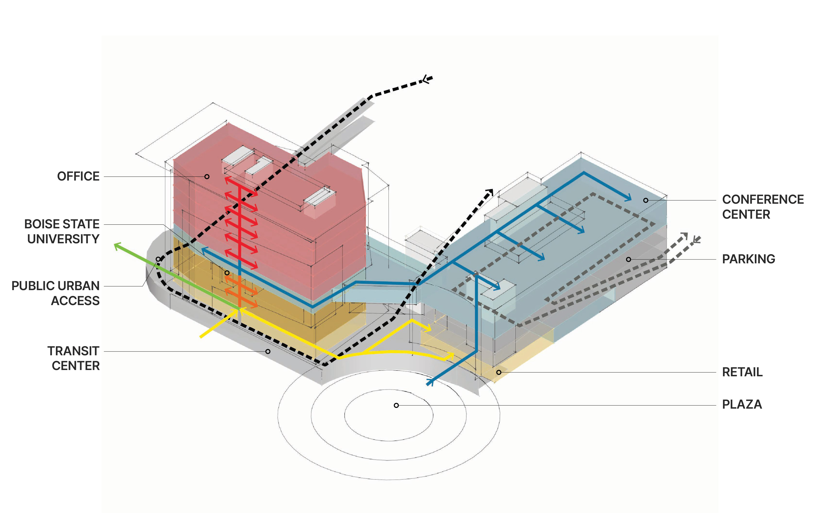 City Center Plaza is what happens when every square foot has to work for someone different. The 371,000-square-foot mixed-use development in downtown Boise stacks a transit hub, retail and restaurants, Boise State University classrooms, emerging technology offices, and convention center space into a single cohesive structure overlooking the city's most prominent public plaza. Every user group came with distinct space criteria — and often competing priorities. Babcock's role as design team leader was to hold all of it together: analyzing each entity's specific needs, synthesizing the conflicts, and producing a building that feels unified rather than negotiated. That it reads as coherent from the street is the point.
