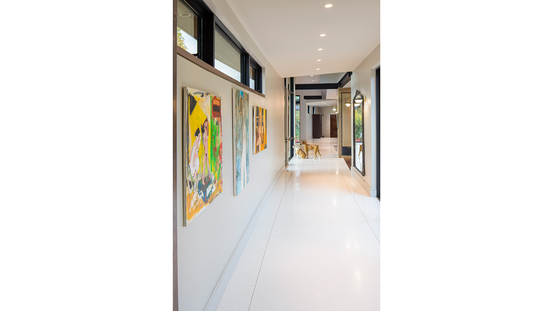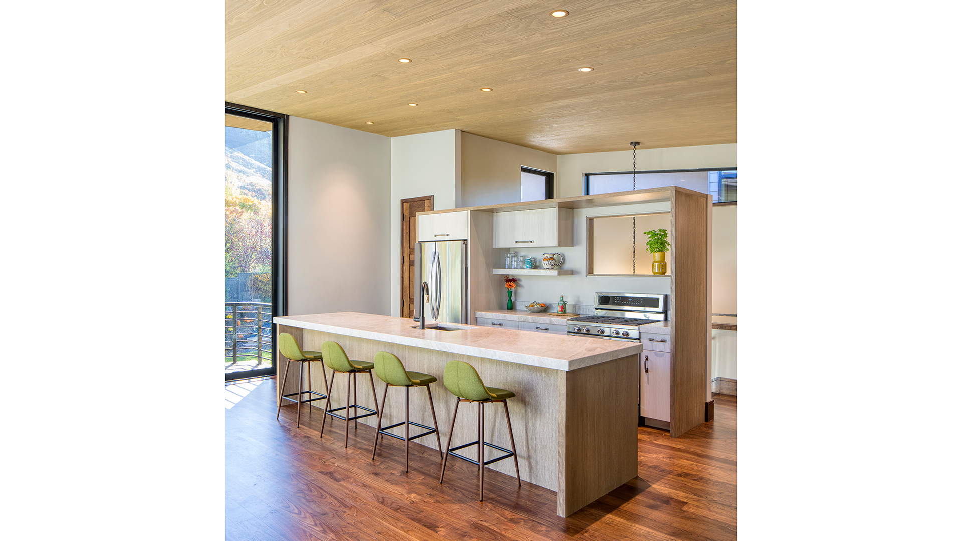 This Salt Lake City foothills residence was designed around a single organizing idea: an urban campground. The home is arranged as three distinct pods connected by a long curved art gallery — a configuration that grew directly from how this family lives, with a deep tradition of large gatherings, extended stays, and spending as much time outdoors as possible. Finishes and fixtures are bold and durable, channeling the honest materiality of quality outdoor gear rather than conventional residential luxury. Entire walls of glazing open to wooded slopes and mountain peaks beyond. The program accommodates everyone: a two-bedroom guest wing on the south end of the gallery with its own entrance, a one-bedroom apartment over the four-car garage on the north end with a deck overlooking the pool terrace, two additional guest suites, and a theater below. It's a home built for the way a family actually wants to live together.