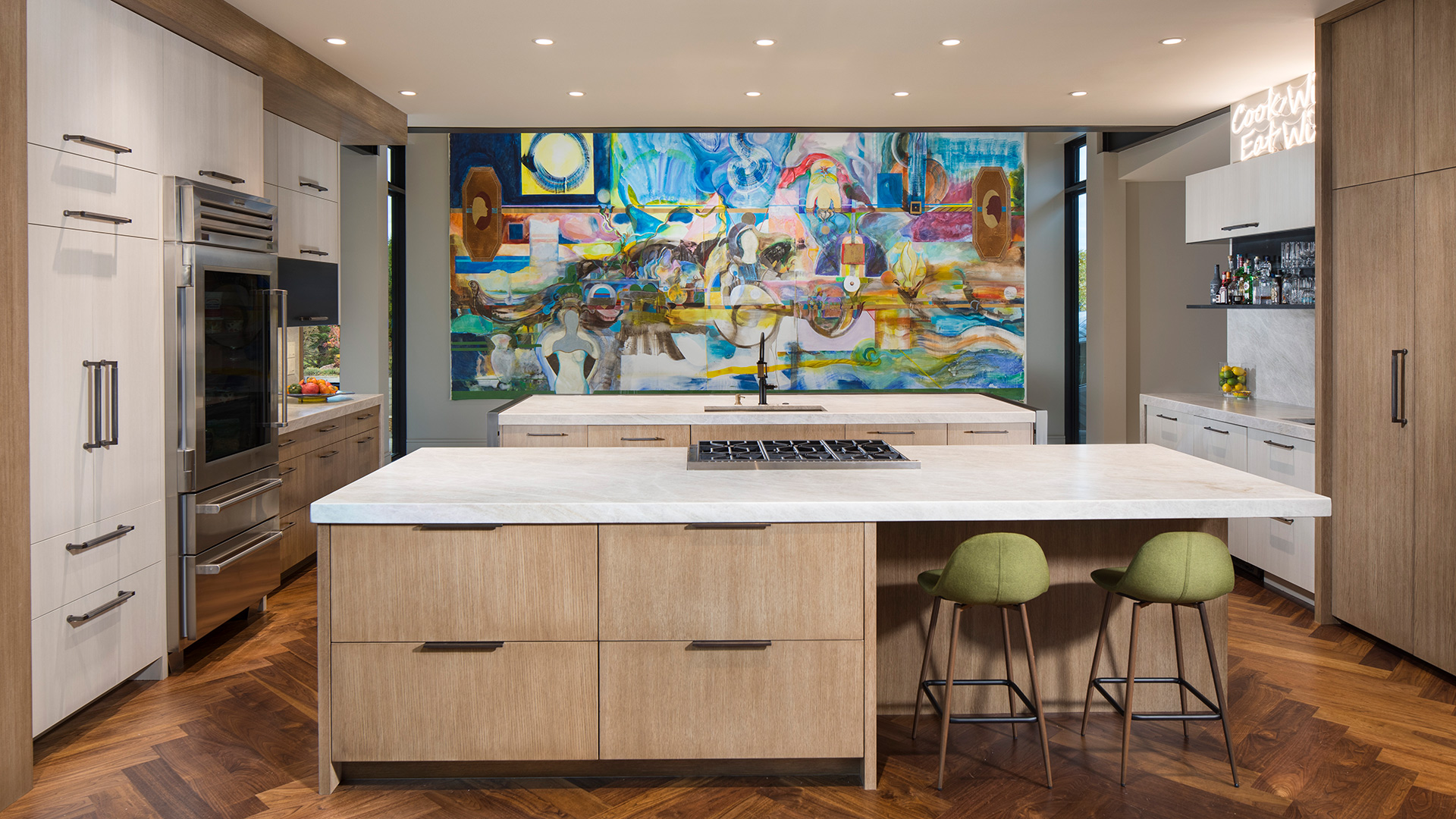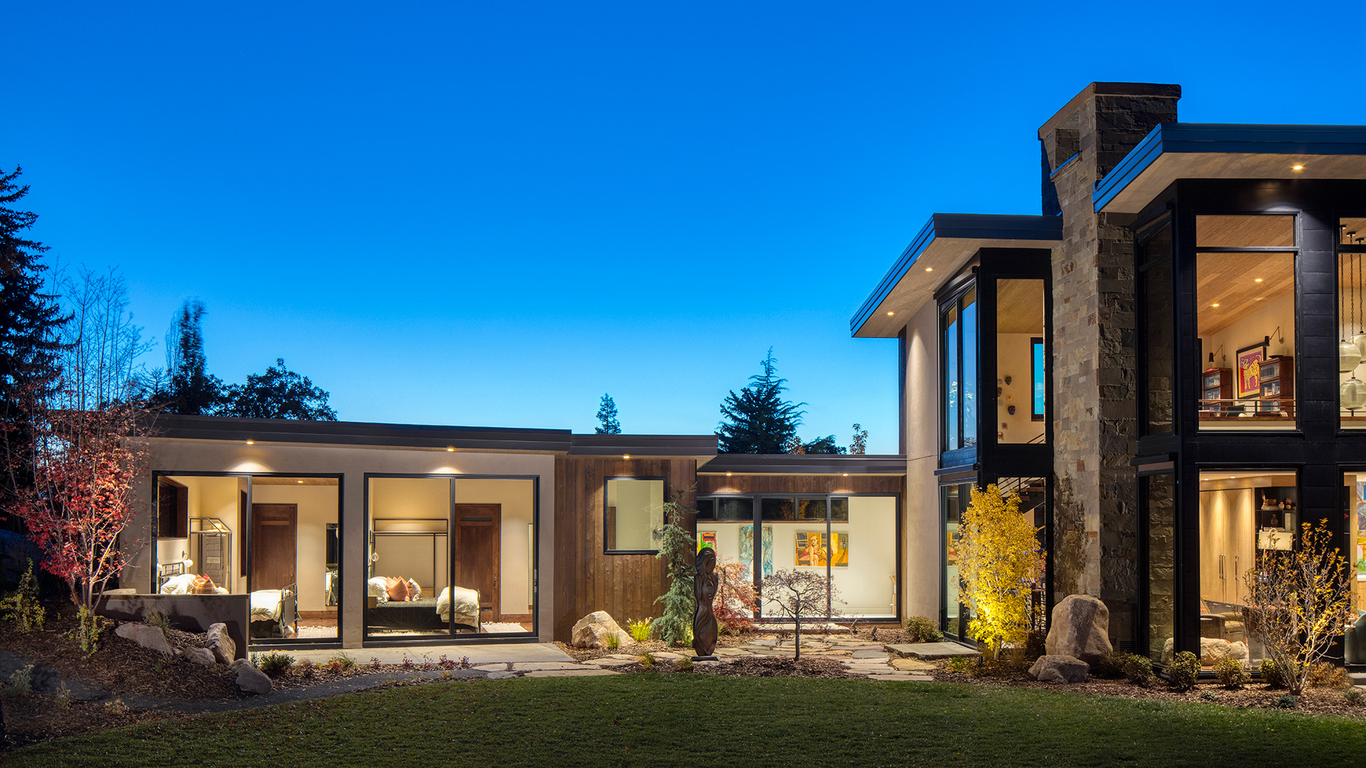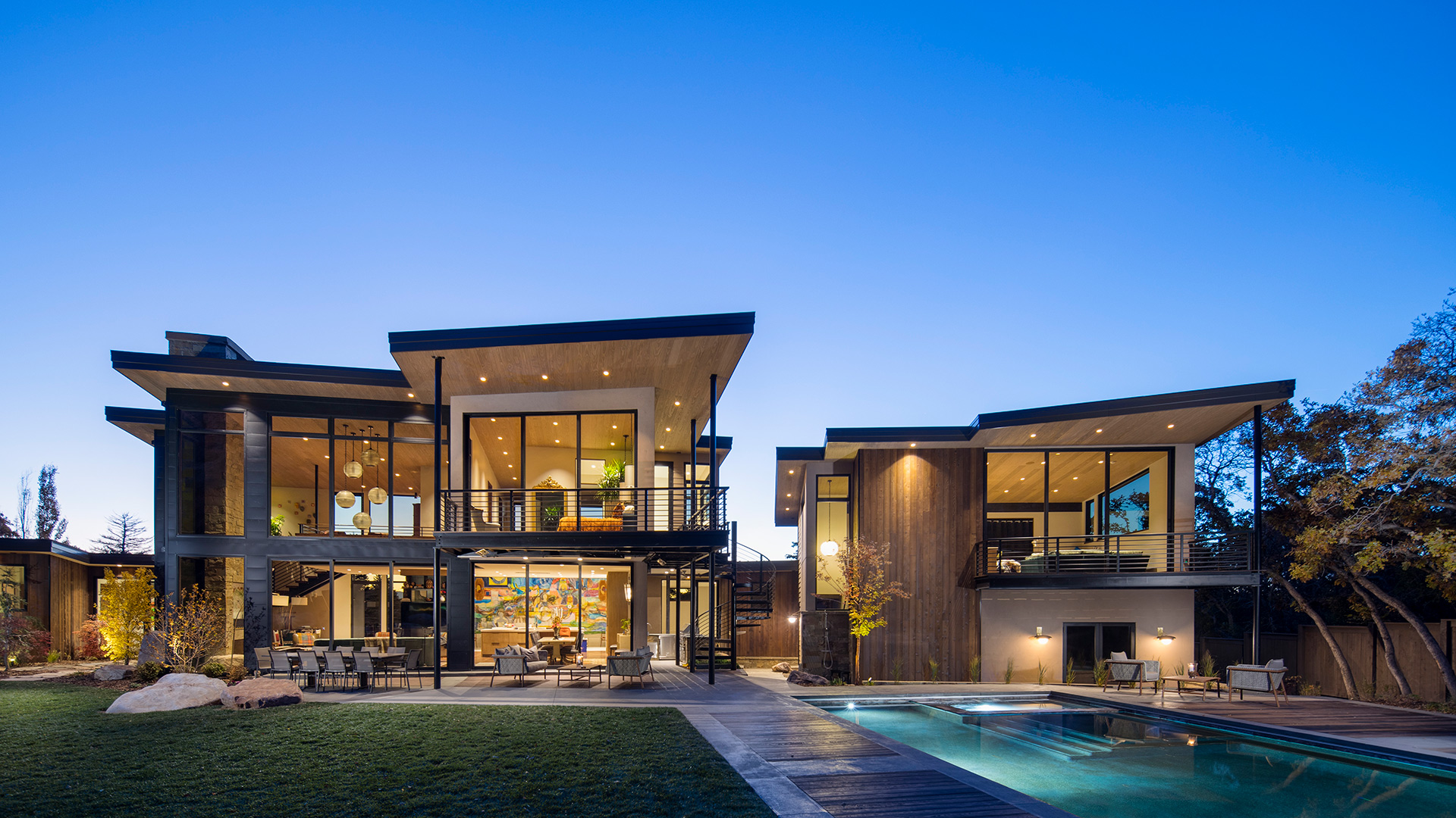 This Salt Lake City foothills residence was designed around a single organizing idea: an urban campground. The home is arranged as three distinct pods connected by a long curved art gallery — a configuration that grew directly from how this family lives, with a deep tradition of large gatherings, extended stays, and spending as much time outdoors as possible. Finishes and fixtures are bold and durable, channeling the honest materiality of quality outdoor gear rather than conventional residential luxury. Entire walls of glazing open to wooded slopes and mountain peaks beyond. The program accommodates everyone: a two-bedroom guest wing on the south end of the gallery with its own entrance, a one-bedroom apartment over the four-car garage on the north end with a deck overlooking the pool terrace, two additional guest suites, and a theater below. It's a home built for the way a family actually wants to live together.