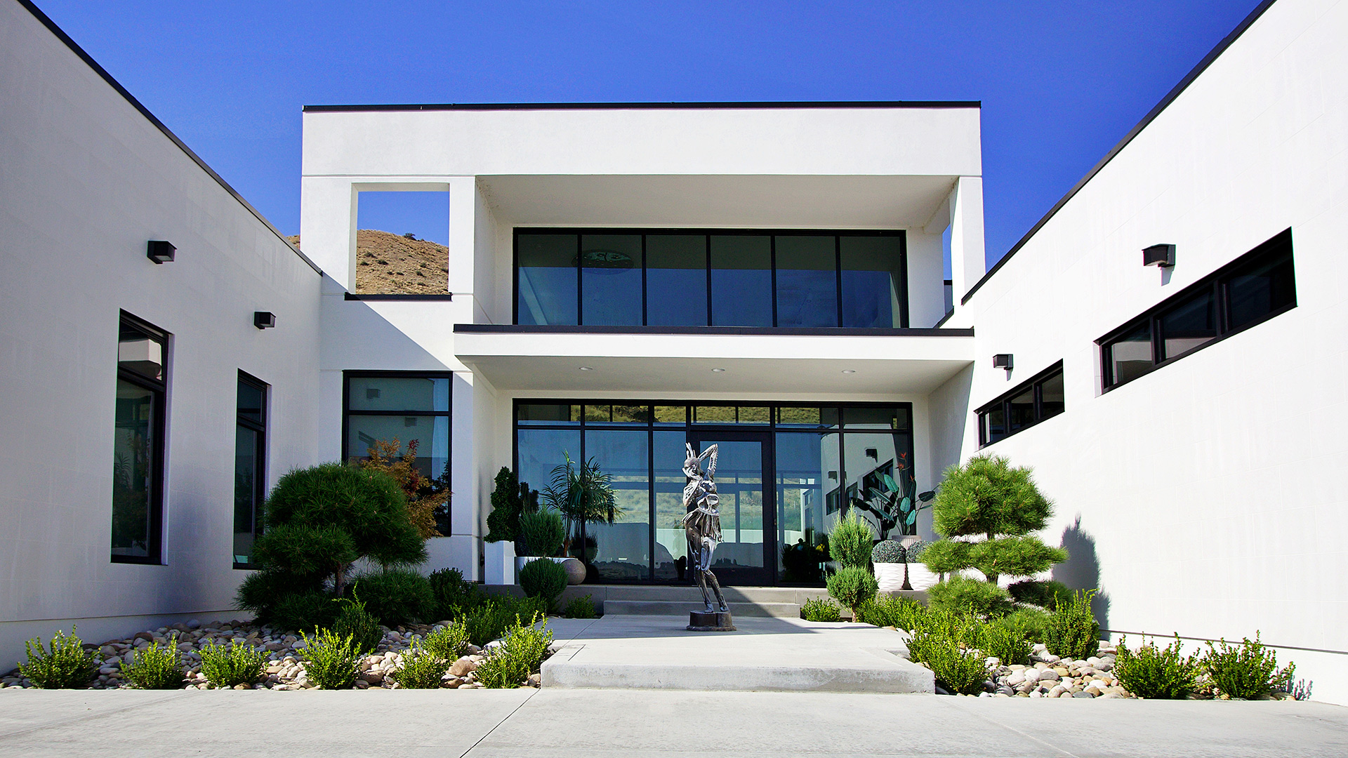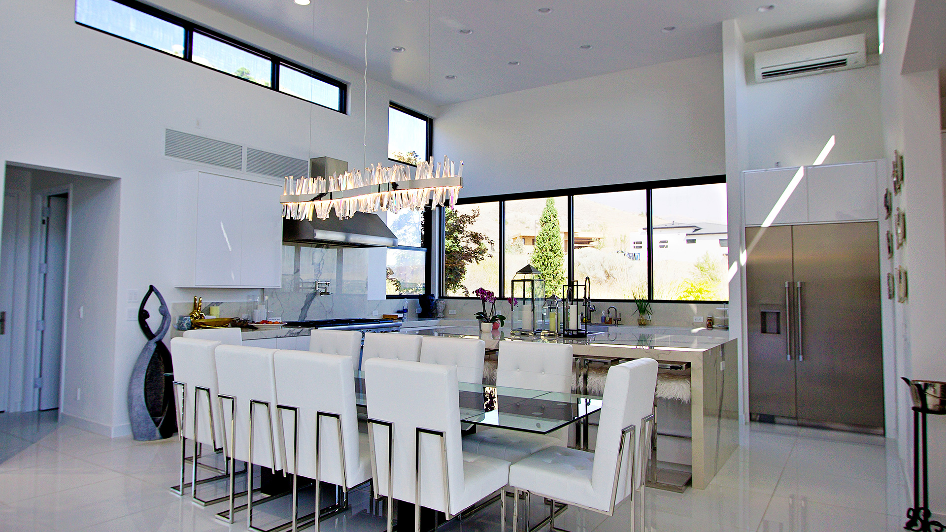 This 4,750-square-foot Boise residence makes no apologies for its ambitions. Double-height living spaces flood with light through black steel-framed clerestory windows, while high-gloss tile floors and a dramatic marble kitchen island set an unmistakably bold tone. The open plan flows from a grand piano in the living area to a kitchen designed for entertaining at scale — generous, polished, and deliberately striking. Against the backdrop of the Boise foothills, it's a home that wears its personality on its sleeve and carries it off.