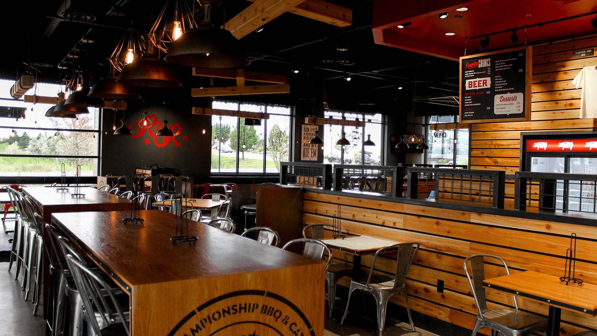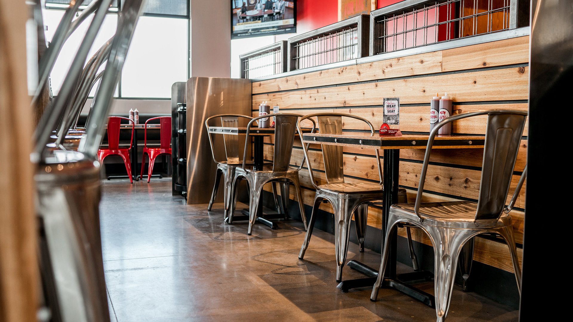 The rough wood and steel interiors produce a rustic yet modern feel, while a chalk art wall and hanging wood ceiling sculptures offer a creative spin on this refreshing design. The covered patio gives diners options and provides a more casual and refreshing dining experience.