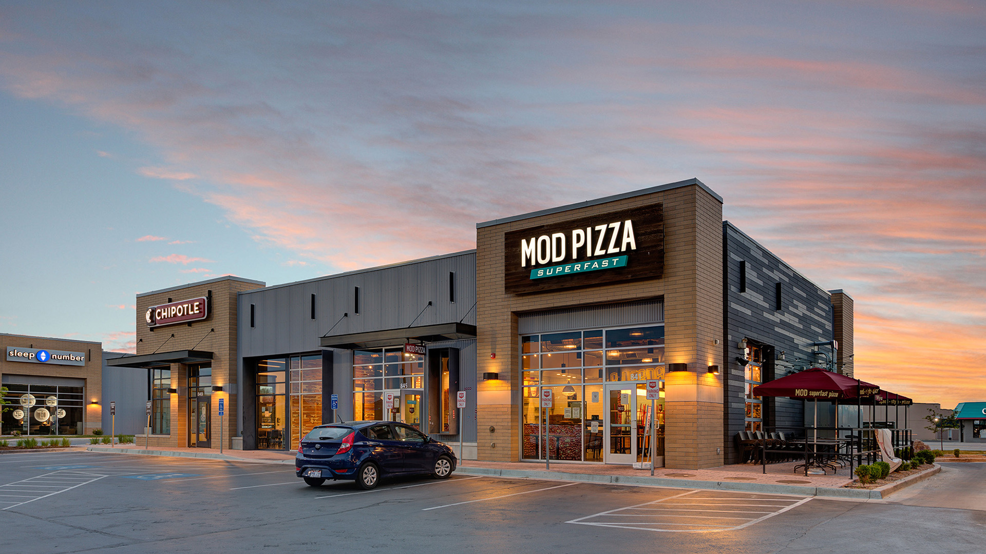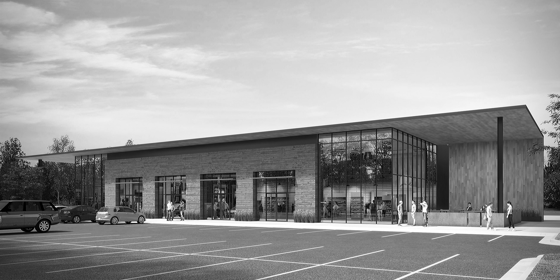 We used premium exterior materials such as European concrete siding (Oko Skin), corrugated metal, and brick to enhance the look of the buildings. The storefronts were designed to be twelve feet high, allowing for magnificent views and natural light. Additionally, we incorporated vertical steel plate fins on the building to enable tenants to mount their signs. These fins not only complement the building's design but also provide designated areas for tenant signage and protect the building exterior finishes during signage installation.